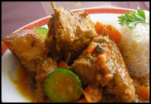 colombo de porc et sa timbale riz: sauté de porc,aubergines,courgettes,pomme de terres,carottes,poivrons,riz et nos epices.